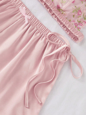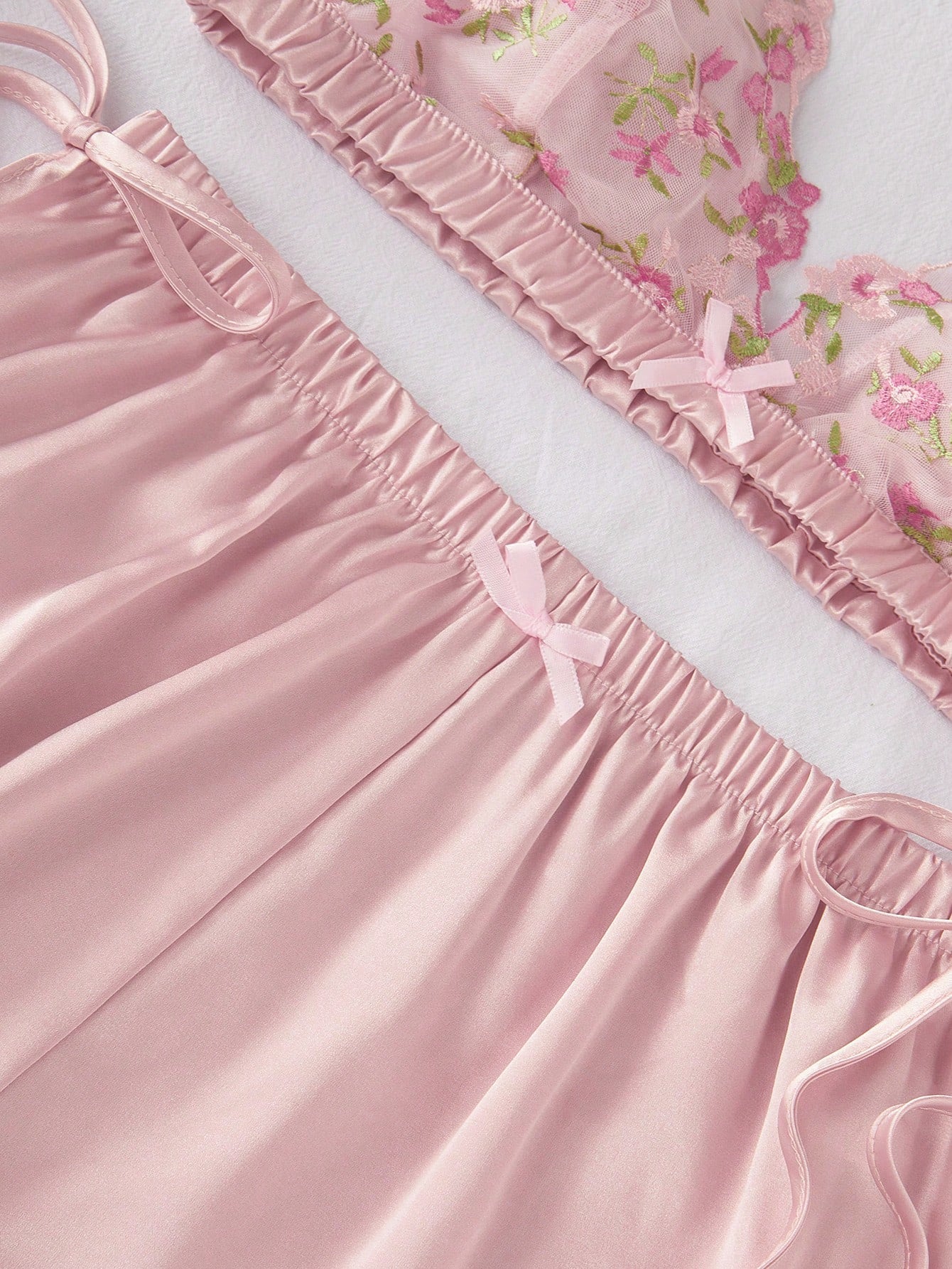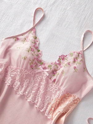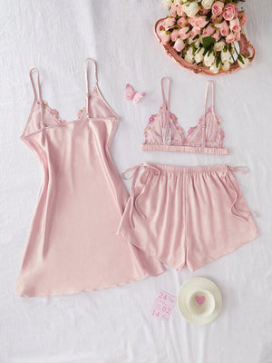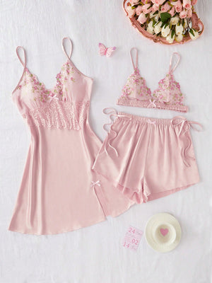 SilkySpell 3 Piece Embroidery Mesh Lace Semi-Sheer Sexy V-Neck Synthetic Silk Pajama Set