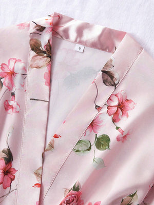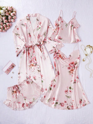5-delige Dames Bloemenprint Synthetische Zijde Pyjama Set, Elegante Kleding