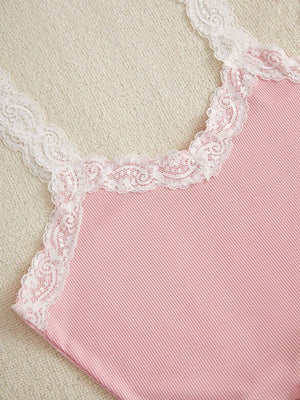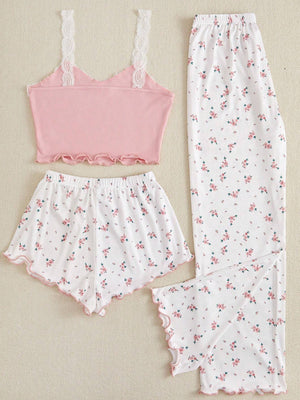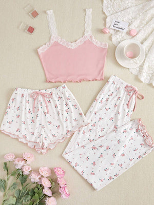 CottageSlumber Dames Lingerie Set – Cami Top met Kantafwerking en Bloemenprint Shorts & Lange Broek Pyjama Set